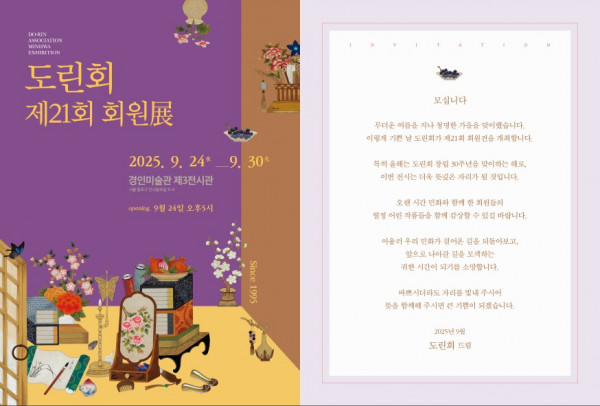 제21회 도린회 정기전 페이지 정보 작성자 관리자 댓글 댓글 0건 조회Hit 8회 작성일Date 26-03-16 00:24 본문 2025년 도린회 정기전 전시 기간: 2025 9.24-30전시장소: 경인미술관 페이스북 공유 트위터 공유 목록 이전글2025 홍익대학교 초대전 26.03.16 다음글제10회 파인회전 26.03.16 댓글 0 댓글목록 등록된 댓글이 없습니다.