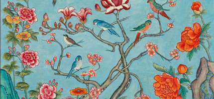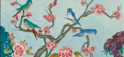 앵무 화조도재료: 한지에 석채 (터키석 바탕)크기: 상징: 장수(바위), 부귀영화(모란꽃), 승진(접비꽃),&nb..