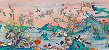제목: 화조도 8폭 (연결)크기: 107x316cm재료: 한지에 석채제작기간: 2019-2023